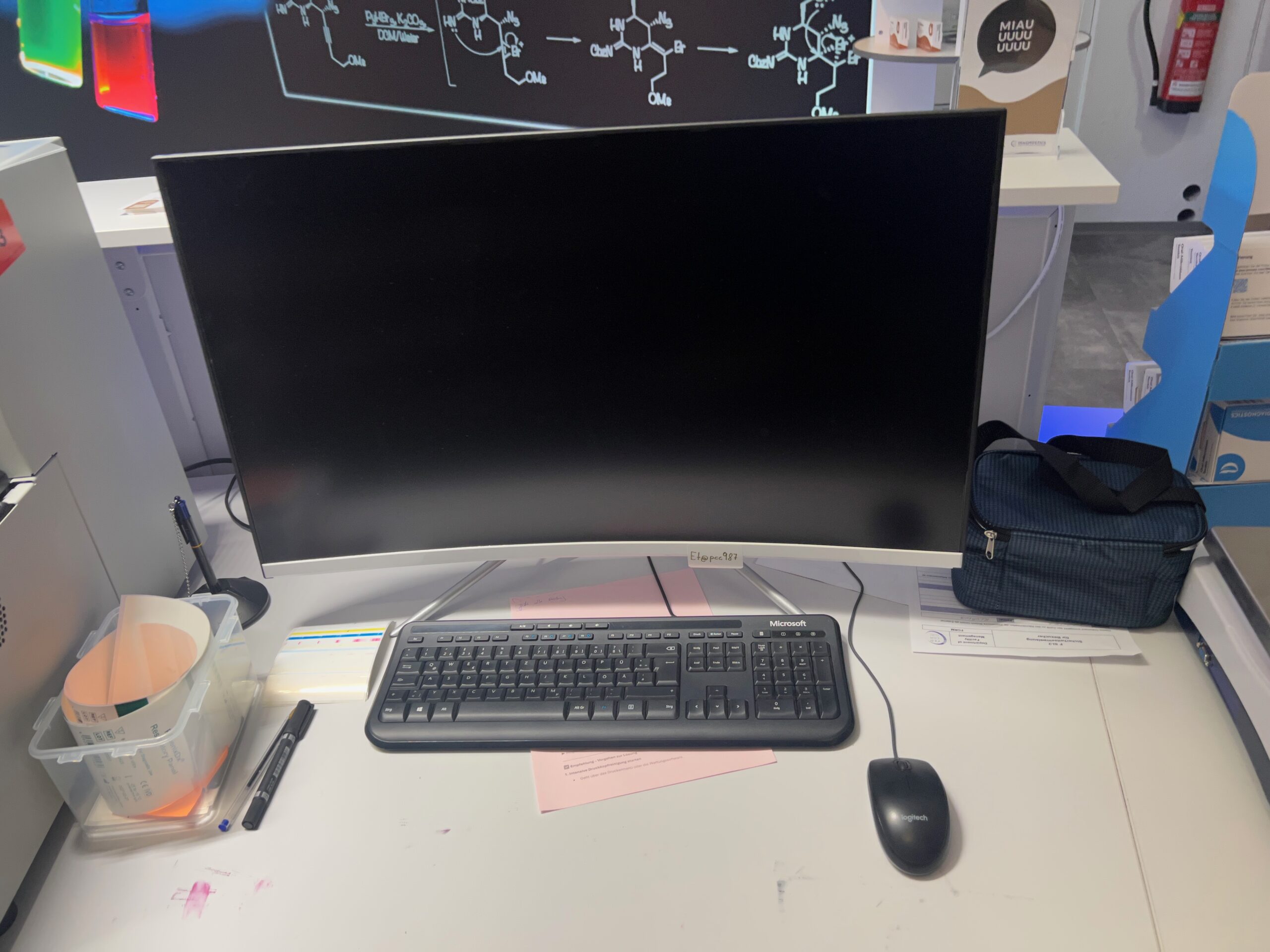 Gebrauchte Büro-Computeranlage mit gebogenem Monitor, Tower, Tastatur und Maus, betriebsbereit.
