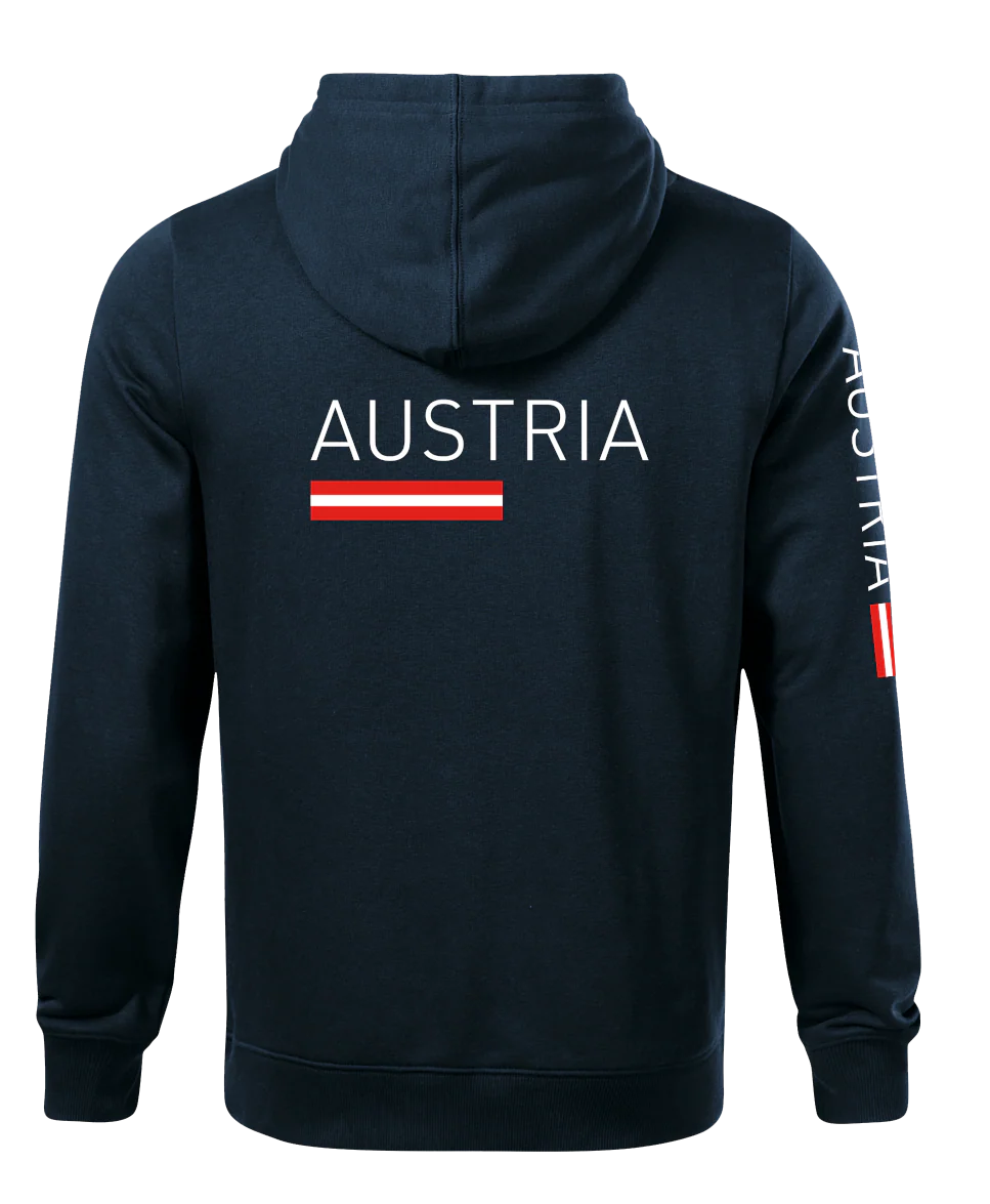 Dunkelblauer Hoodie mit AUSTRIA-Print und Flaggenstreifen, neuwertig, weiche Baumwollmischung.