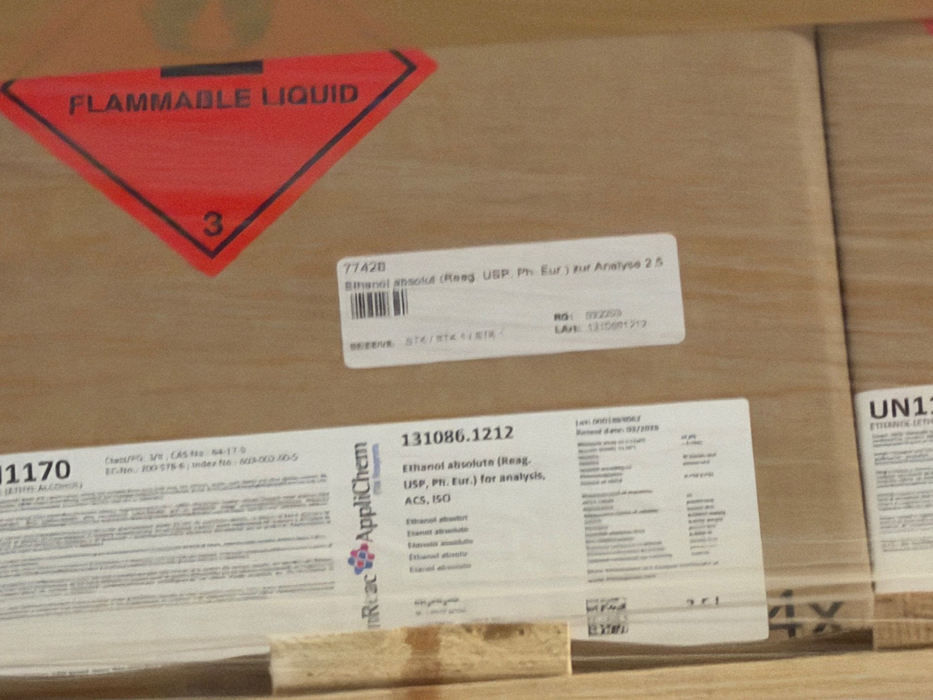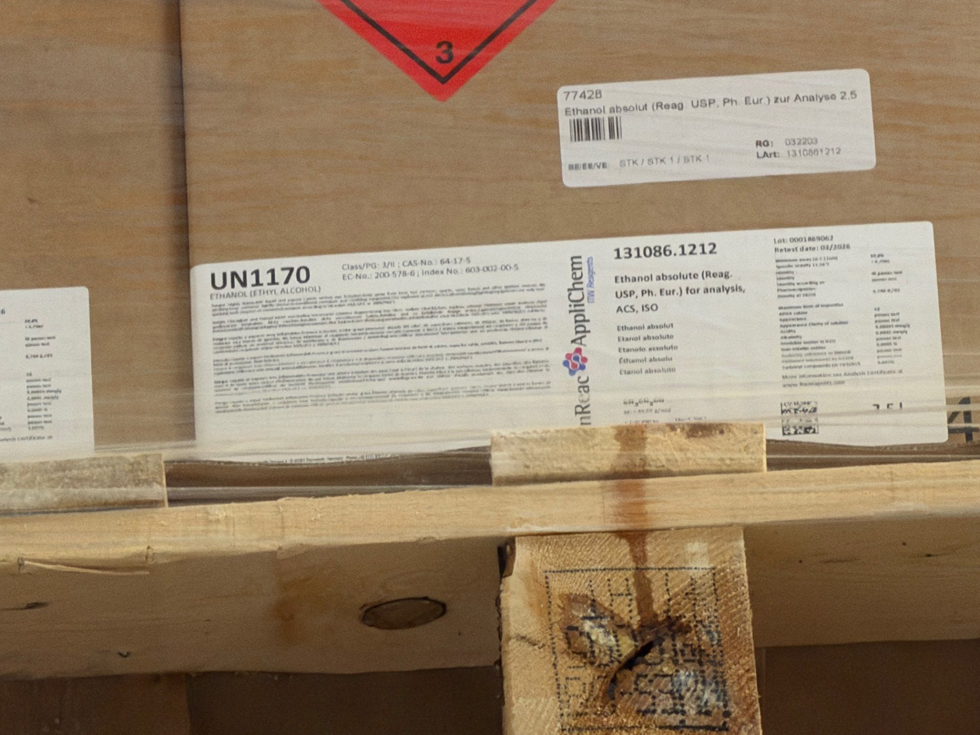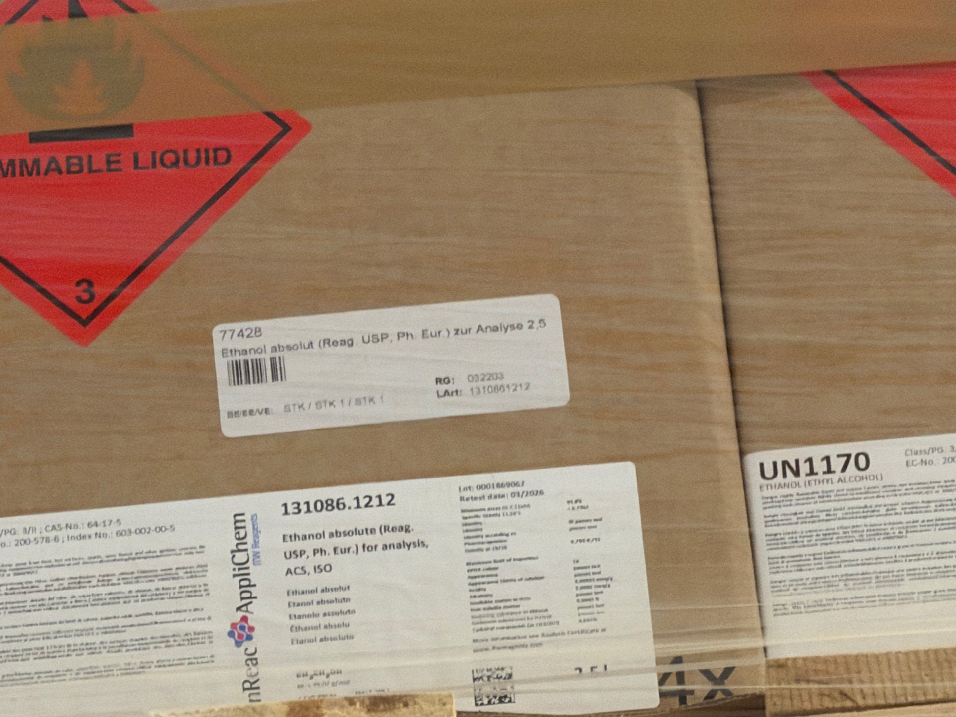 Pauschale mit 96 x 2,5 l Kanistern Ethanol absolut (Reagenzqualität, USP/Ph. Eur.) – Gesamtmenge 240 l. Die Kanister sind in Originalkartons auf Palette verschweißt, mit UN1170- und Gefahrgutkennzeichnung (entzündbare Flüssigkeit, Klasse 3) und scheinen unversehrt und ungeöffnet. Hersteller-/Produktetiketten (AppliChem / Ethanol absolute, Artikel-Nr. 131086.1212) sind sichtbar; ideal für Laboranwendungen oder industrielle Nutzung. Bitte beachten: Gefahrstofftransport und fachgerechte Lagerung erforderlich.